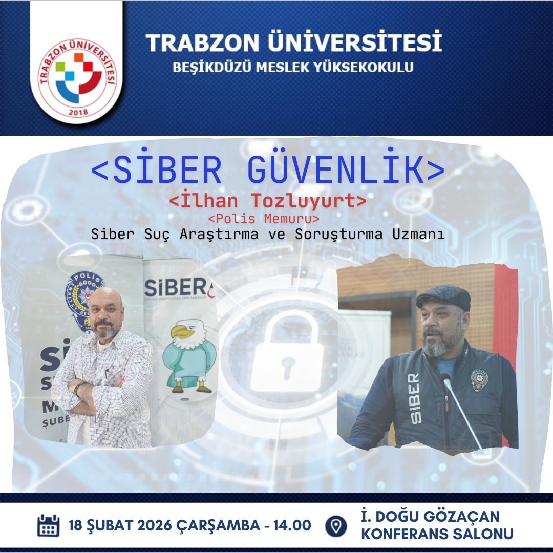 Siber Güvenlik Konulu Eğitim; İlhan Tozluyurt, Polis Memuru, Siber Suç Araştırma ve Soruşturma Uzmanı, 18 Şubat 2026 Çarşamba, 14.00, İ. Doğu Gözaçan Konferans Salonu