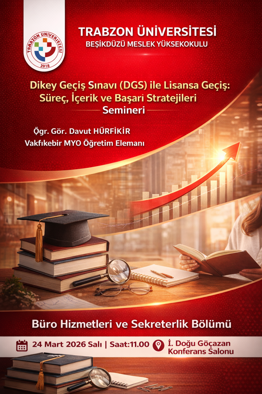Büro Hizmetleri ve Sekreterlik Bölümü; Dikey Geçiş Sınavı (DGS) ile Lisansa Geçiş: Süreç, İçerik ve Başarı Stratejileri Semineri, 24 Mart 2026 Salı Saat 11.00, İ. Doğu Gözaçan Konferans Salonu