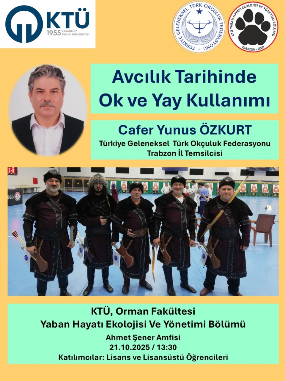 Okulumuz öğretim elemanı, Öğr. Gör. C.Yunus Özkurt, KTÜ Orman Fakültesi Yaban Hayatı Ekolojisi ve Yönetimi Bölümü öğrencilerine, "Avcılık Tarihinde Ok ve Yay Kullanımı" konulu bir eğitim semineri verdi.