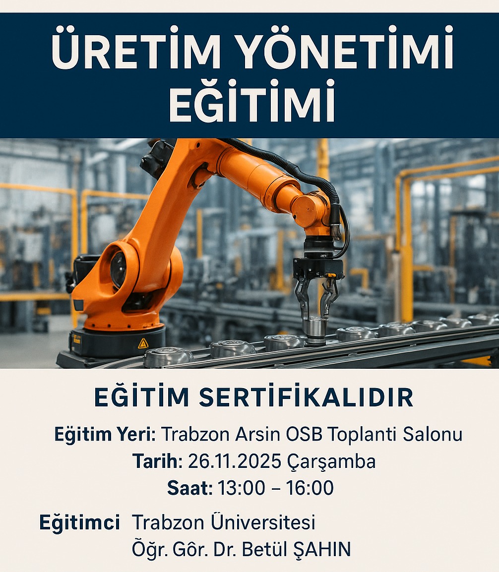 Trabzon Üniversitesi Beşikdüzü Meslek Yüksekokulu olarak, Arsin Organize Sanayi Bölgesi ile güç birliği yaparak 26 Kasım 2025 Çarşamba günü “Üretim Yönetimi Eğitimi” gerçekleştirdi.