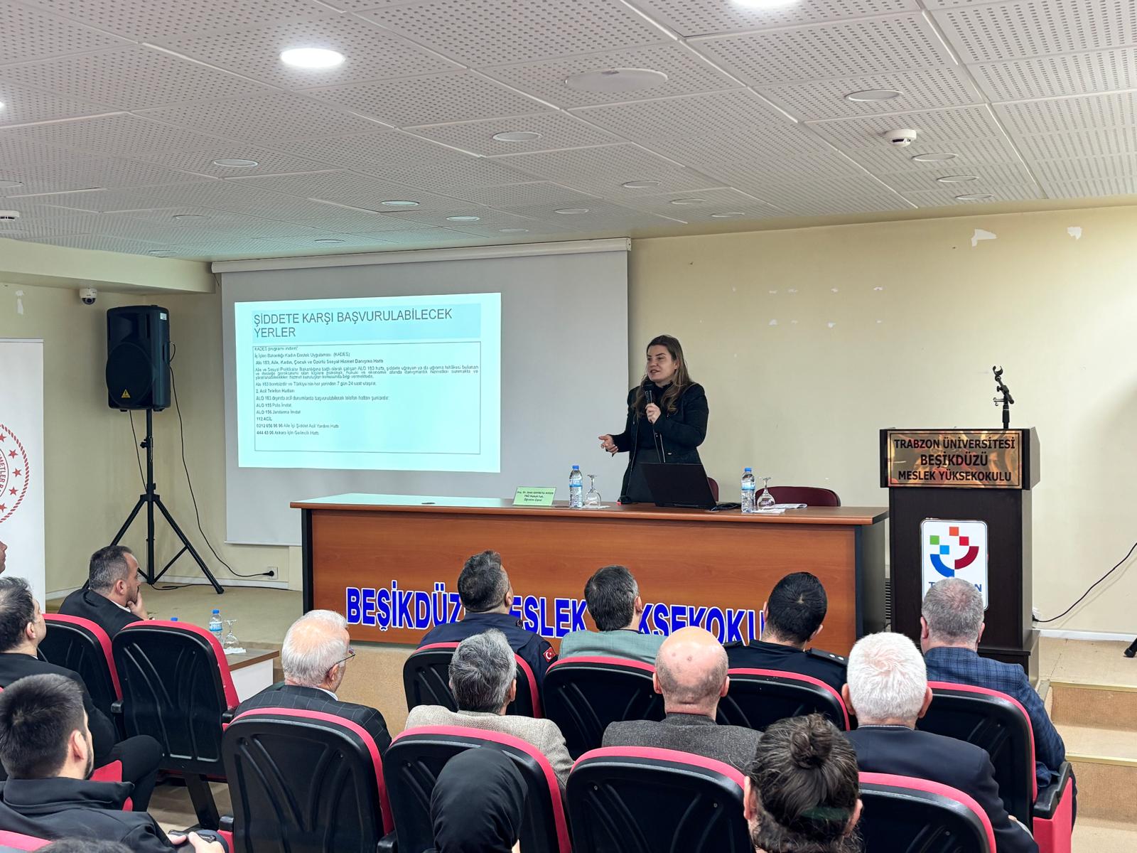 Trabzon Üniversitesi Hukuk Fakültesi Öğretim Üyesi Doç. Dr. Seda Gayretli Aydın tarafından verilen “Şiddetsiz Aile, Güçlü Toplum” konferansı; ilçemizin mülki amirleri, kurum temsilcileri, okulumuz akademik ve idari personeli ile öğrencilerimizin de katılımıyla yüksekokulumuzda gerçekleştirildi.