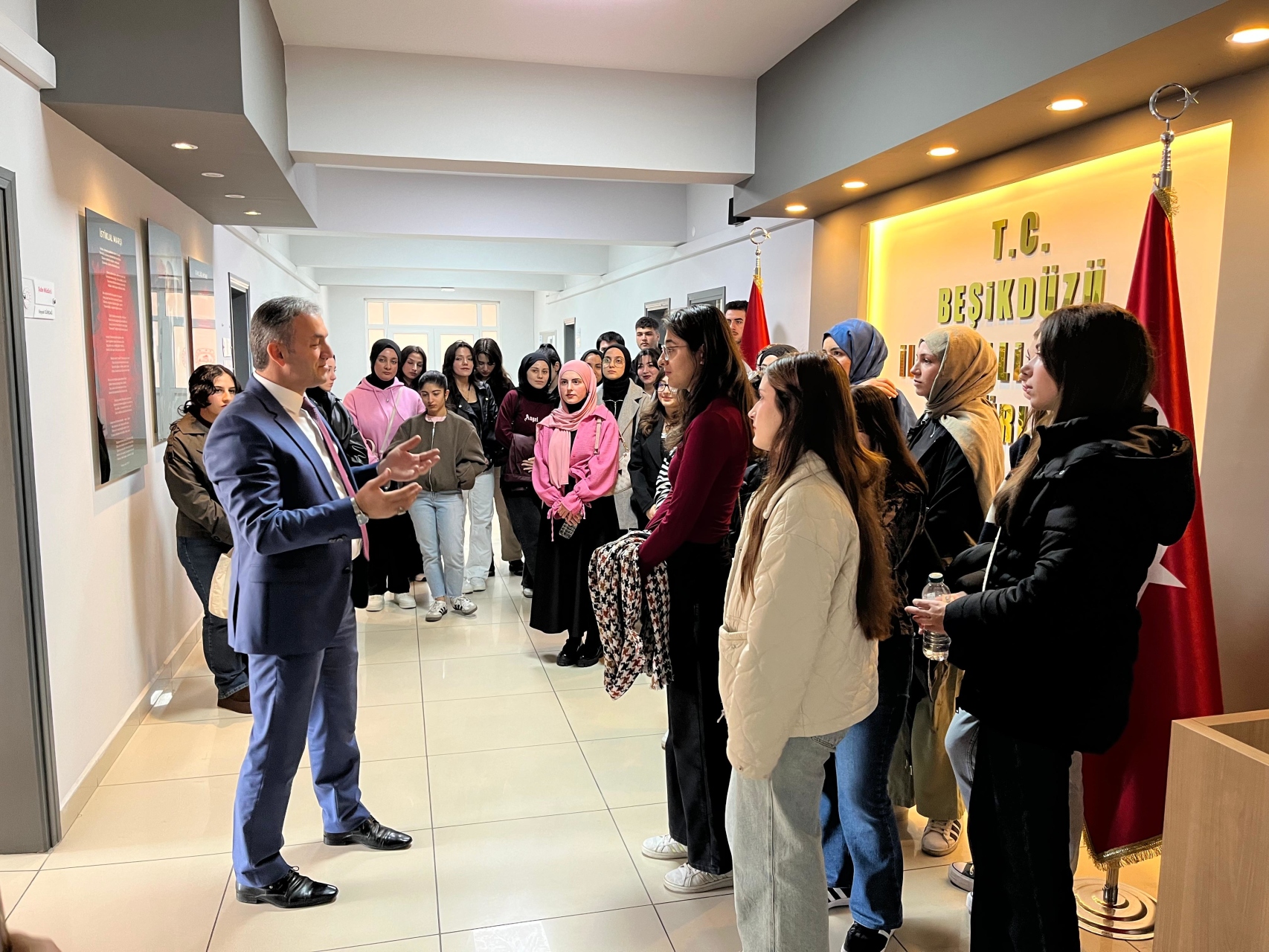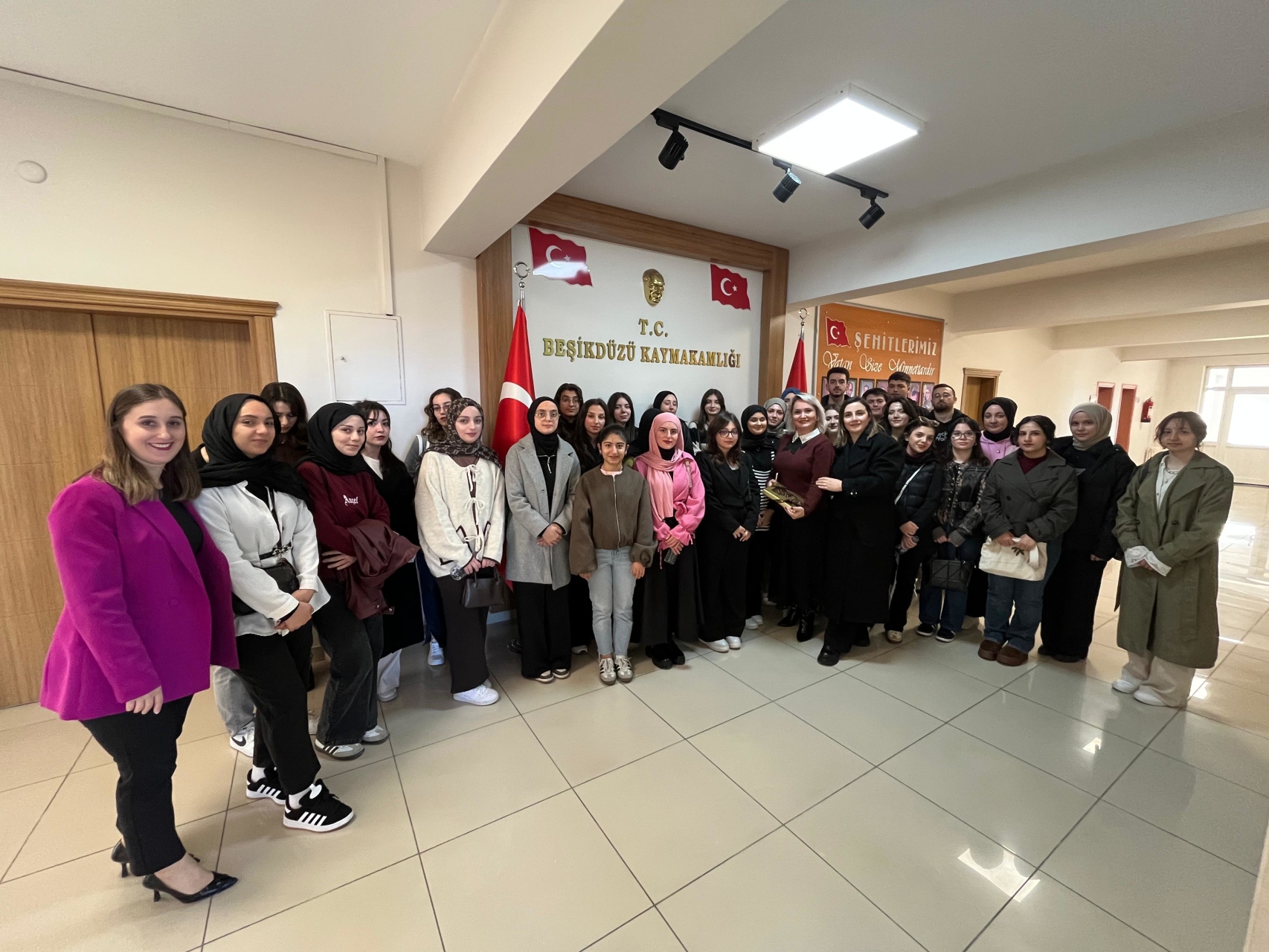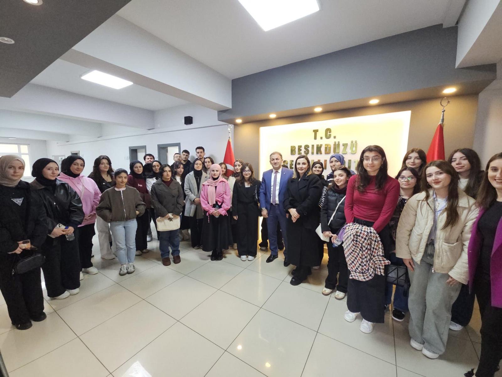 Dr. Öğr. Üyesi Filiz Köyel ve Öğr. Gör. Dr. Hamza Corut koordinatörlüğünde, Büro Yönetimi ve Yönetici Asistanlığı Programı 1. sınıf öğrencileri, Meslek Etiği dersi kapsamında “Kamu ve Özel Sektörde Meslek Etiği: Kurumsal Uygulamaları Yerinde İnceleme Ziyareti” adlı teknik geziye katıldı. Gezinin ilk durağı Beşikdüzü Kaymakamlığı oldu. İlçe Kaymakamı Sayın Ferhat Vardar, öğrencilerle tanışarak açılış konuşmasını gerçekleştirdi. Ardından öğrenciler; Kaymakamlık, İlçe Millî Eğitim Müdürlüğü, İlçe Tapu Müdürlüğü, İlçe Mal Müdürlüğü, İlçe Nüfus Müdürlüğü, İlçe Tarım ve Orman Müdürlüğü birimlerini ziyaret ederek kurum müdürlerinden bilgi aldı ve kamu hizmetlerinin işleyişini yerinde gözlemledi. İlçe Millî Eğitim Müdürü Sayın Ziya Durmuş, öğrencilere yönelik “Kamuda Meslek Etiği” konulu sunum yaptı ve soru-cevap bölümü düzenledi.