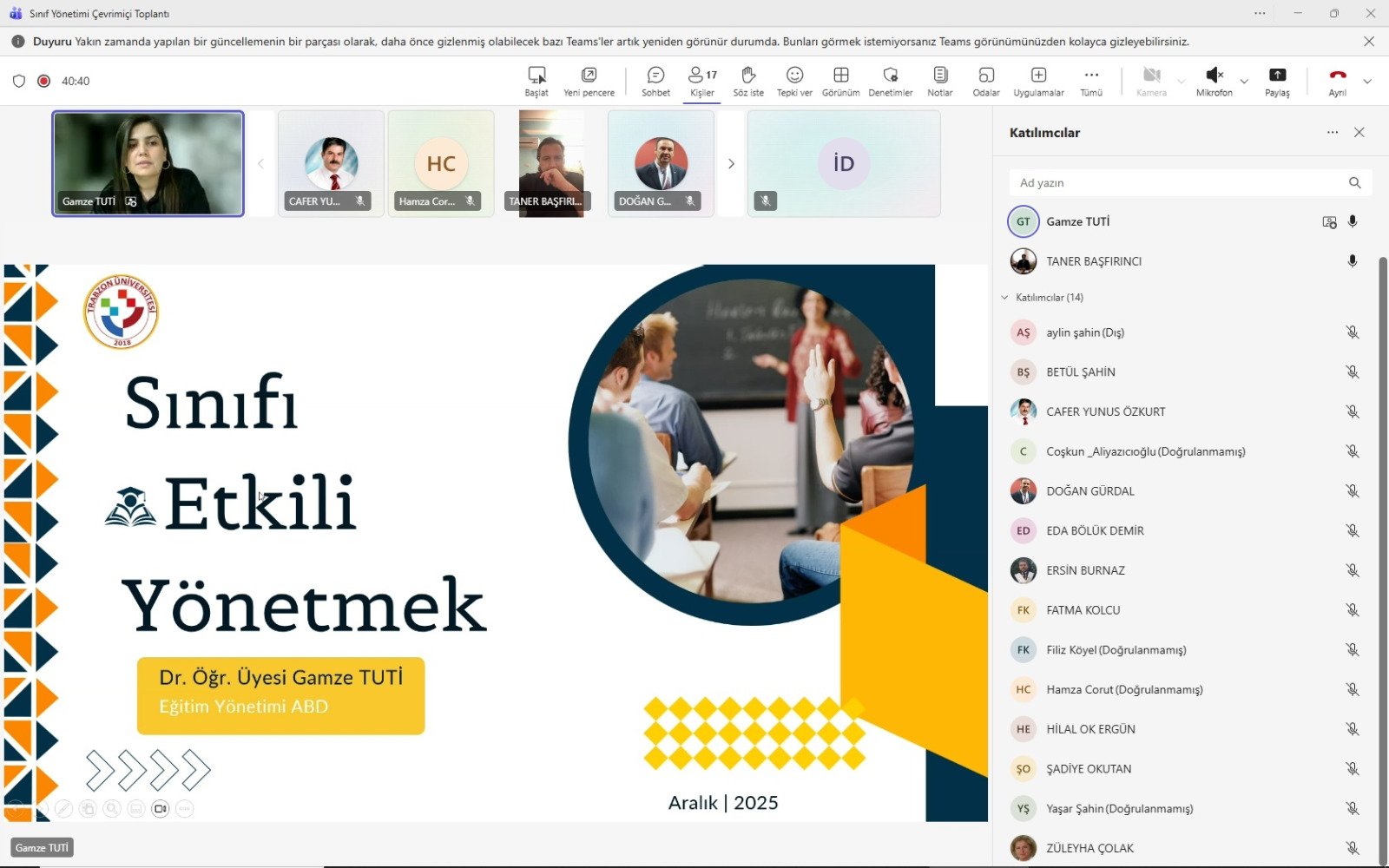 Okulumuz akademik kadrosuna yönelik olarak gerçekleşen eğitim kapsamında; öğrencilerimizi anlayabilme, onlara yardımcı olabilme ve çözüm odaklı yaklaşımlar ile ders ortamında sınıf içi iletişimi güçlendirme, etkili ve verimli sınıf yönetimi hakkında güncel ve uygulamaya dönük bilgilendirmeler yapıldı. Soru-Cevaplar ile de devam ettirilen eğitim kapsamında davetli konuşmacı ile karşılıklı etkileşimler yapılarak eğitim tamamlandı.