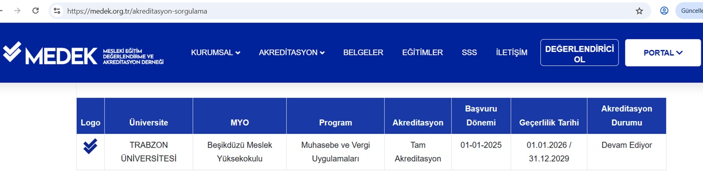 Okulumuz Muhasebe ve Vergi Bölümü / Muhasebe ve Vergi Uygulamaları Programı, yetkili değerlendirici kuruluş MEDEK tarafından yapılan değerlendirmeler sonucunda Akredite olarak Tam Akreditasyon kapsamında 01.01.2026 - 31.12.2029 tarihleri aralığında dört (4) yıllık bir süre için Akreditasyon Belgesi almaya hak kazanmıştır.