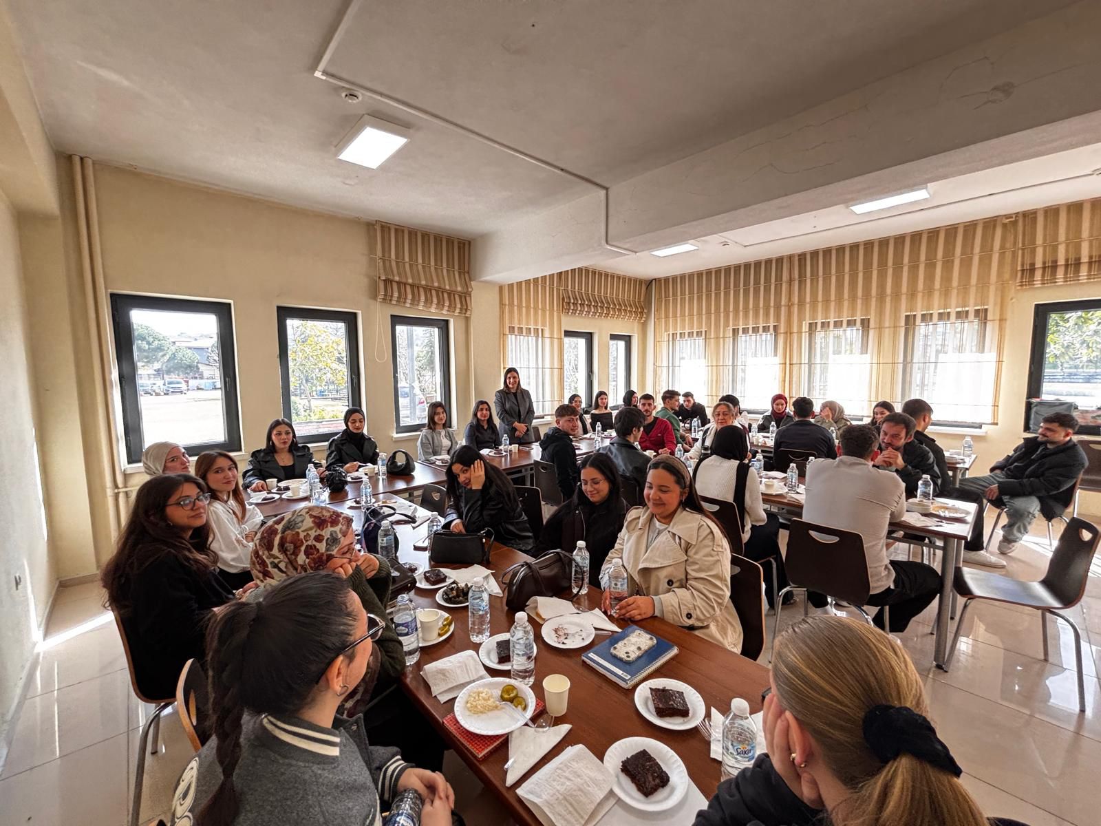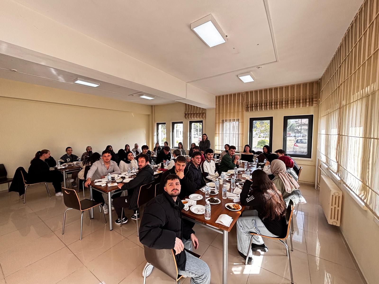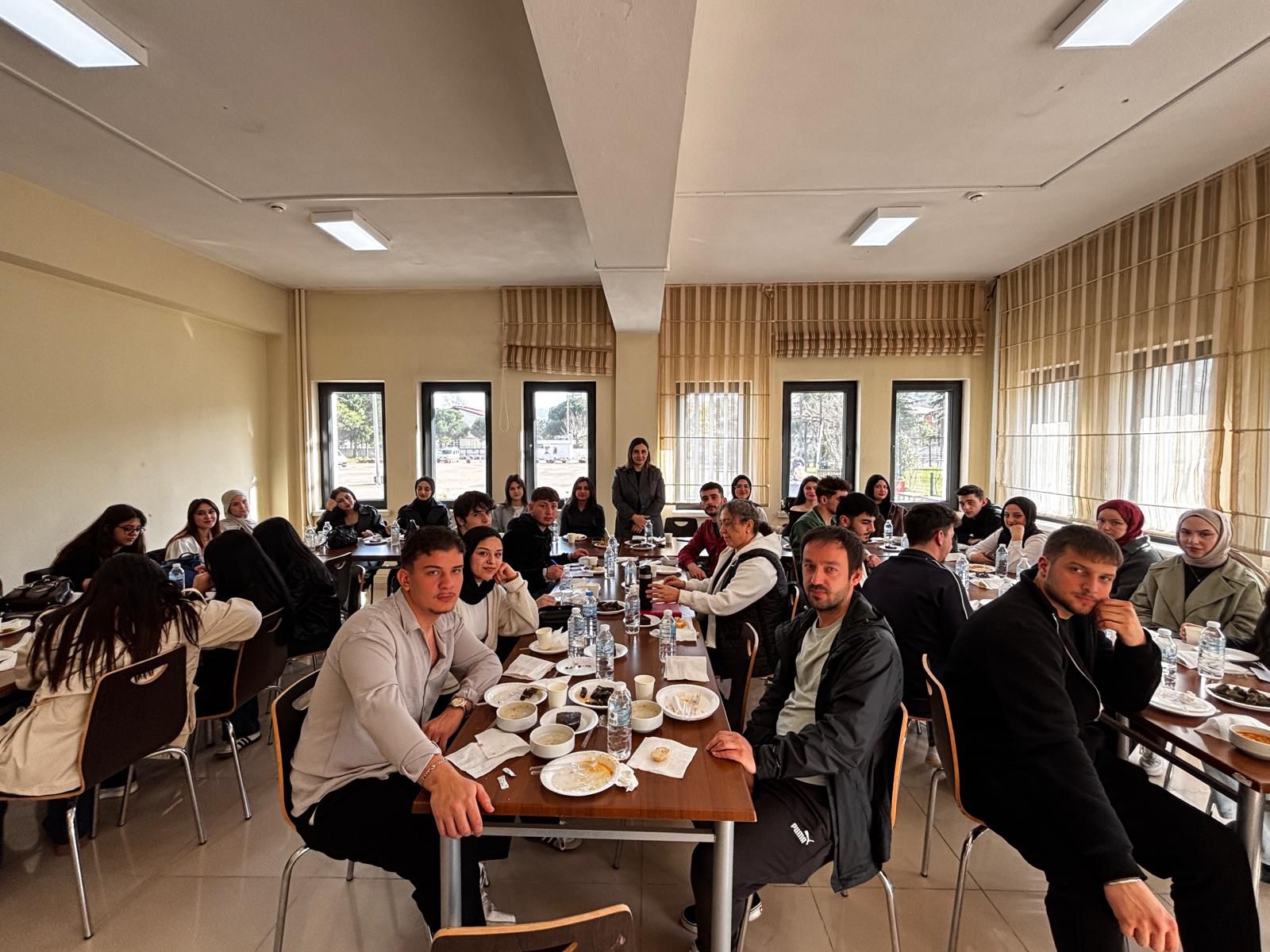 Dış Ticaret Bölümü öğrencileri ile Bölüm Başkanı Dr. Öğr. Üyesi Filiz Köyel bir araya gelerek 2025–2026 Eğitim-Öğretim Yılı bahar dönemine yönelik oryantasyon ve değerlendirme toplantısı gerçekleştirdi. Okul yemekhanesinde düzenlenen etkinlik, öğrencilerle akademik iletişimi güçlendirmek ve yeni döneme ilişkin süreçleri birlikte planlamak amacıyla organize edildi. Bu yemekli buluşmada öğrenciler; akademik süreçler, mesleki gelişim fırsatları, sektörle iş birliği çalışmaları, dönem içinde planlanan etkinlikler ve kariyer hedefleri hakkında bilgilendirildi. Aynı zamanda öğrencilerin görüş, öneri ve beklentileri dinlenerek karşılıklı fikir alışverişinde bulunuldu.