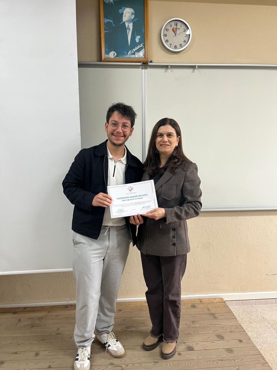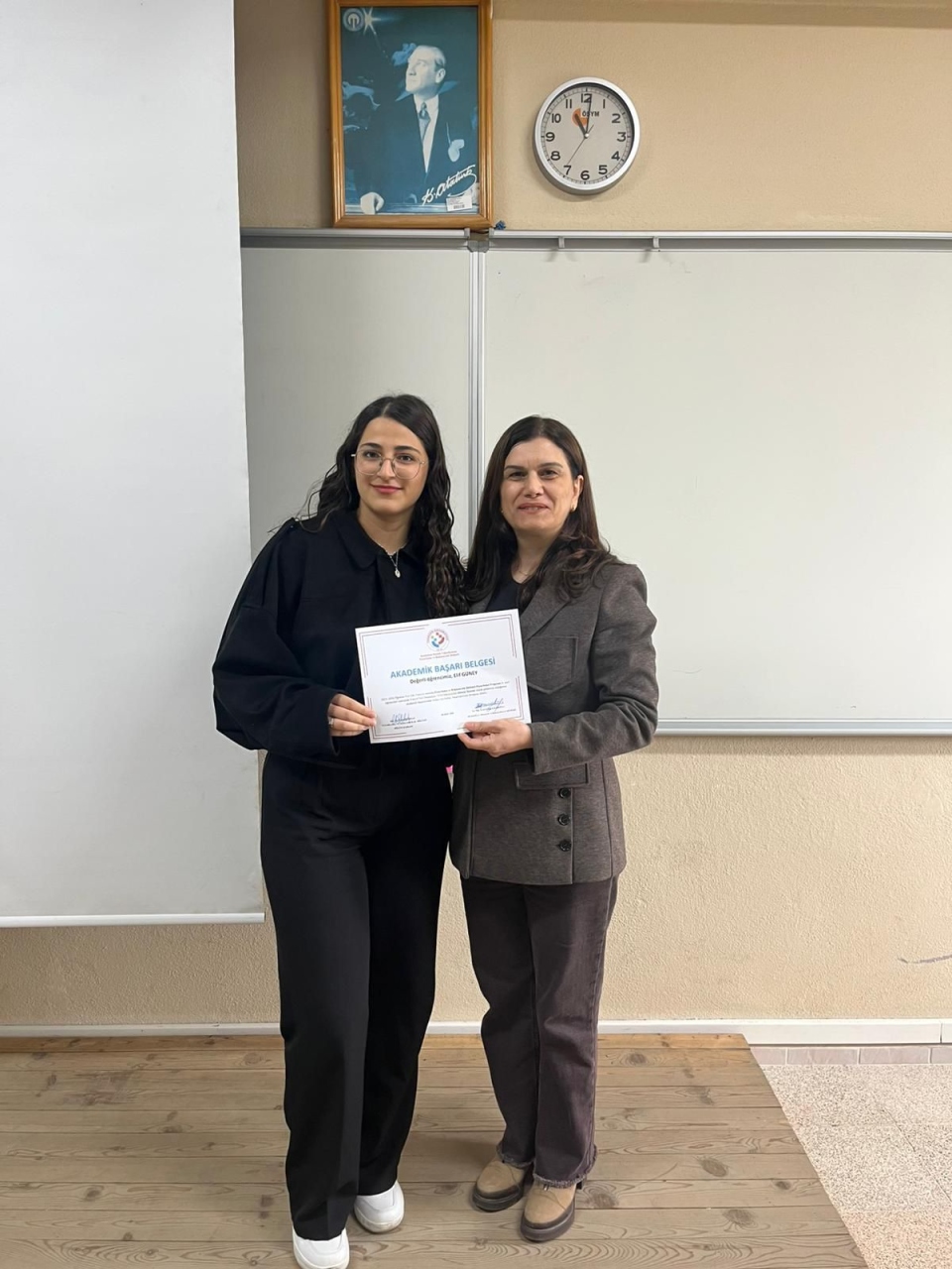 Okulumuz Pazarlama ve Reklamcılık Bölümü bünyesinde yer alan Pazarlama Programı İkinci sınıf öğrencileri içerisinden, 2025-2026 Güz yarıyılı kapsamında Yarıyıl Not Ortalaması - YNO sıralamasında birinci, ikinci ve üçüncü olan öğrencilerimize, Akademik Başarı Belgeleri danışmanları Öğretim Görevlisi Sema GÜZELCİK aracılığı ile takdim edildi. Öğrencilerimizi göstermiş oldukları akademik başarıları nedeniyle kutluyor, başarılarının devamını diliyoruz.